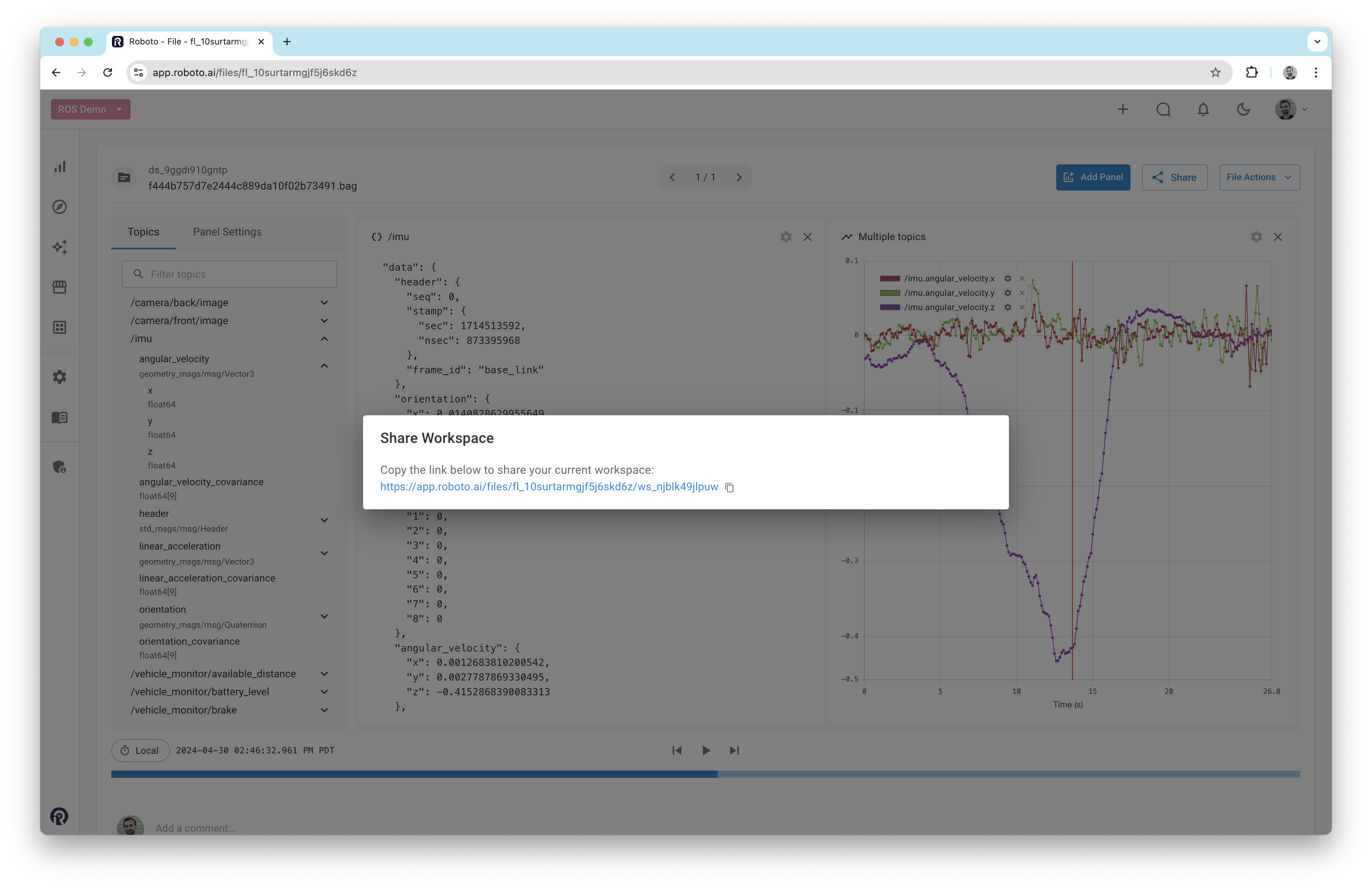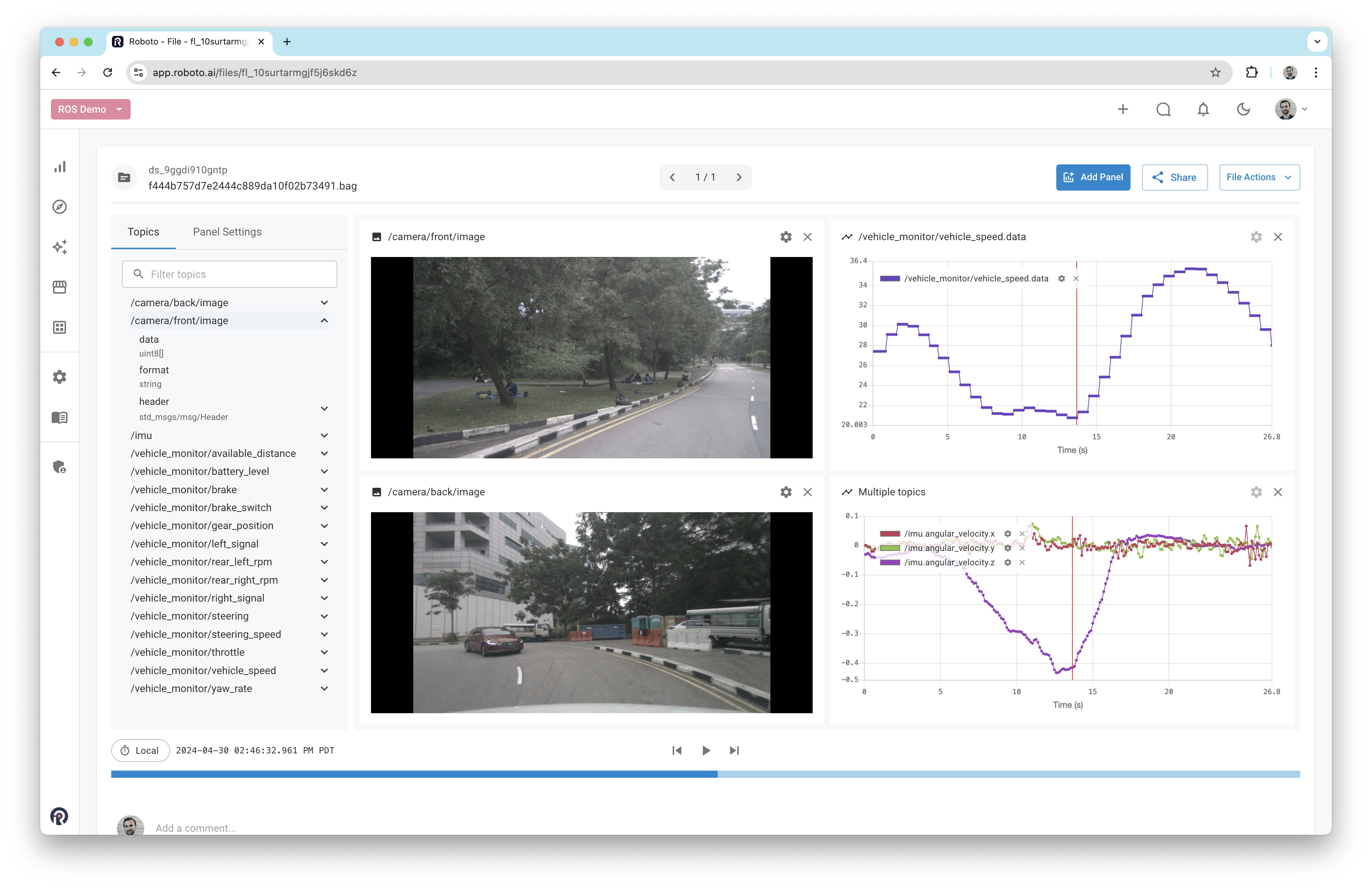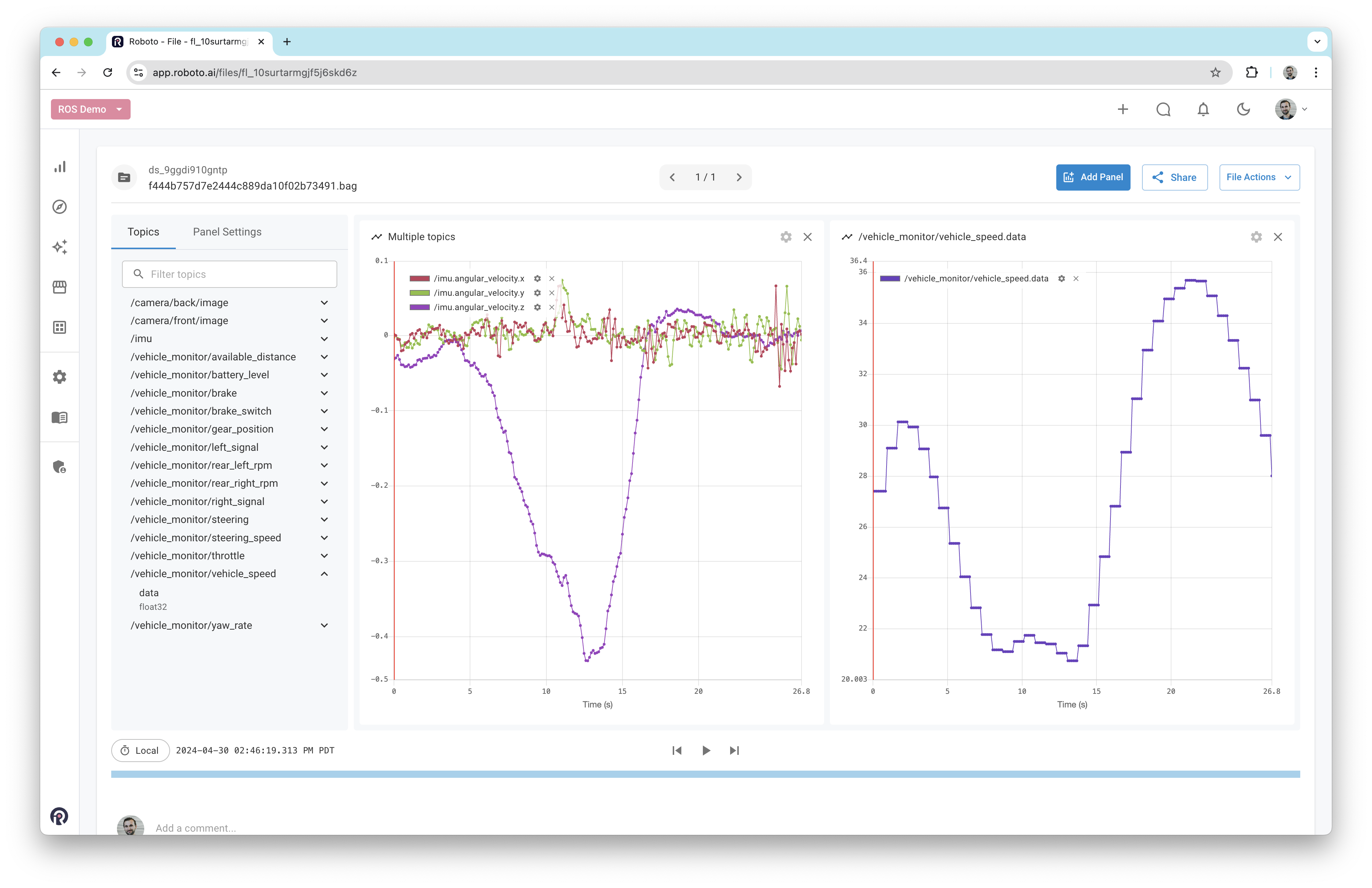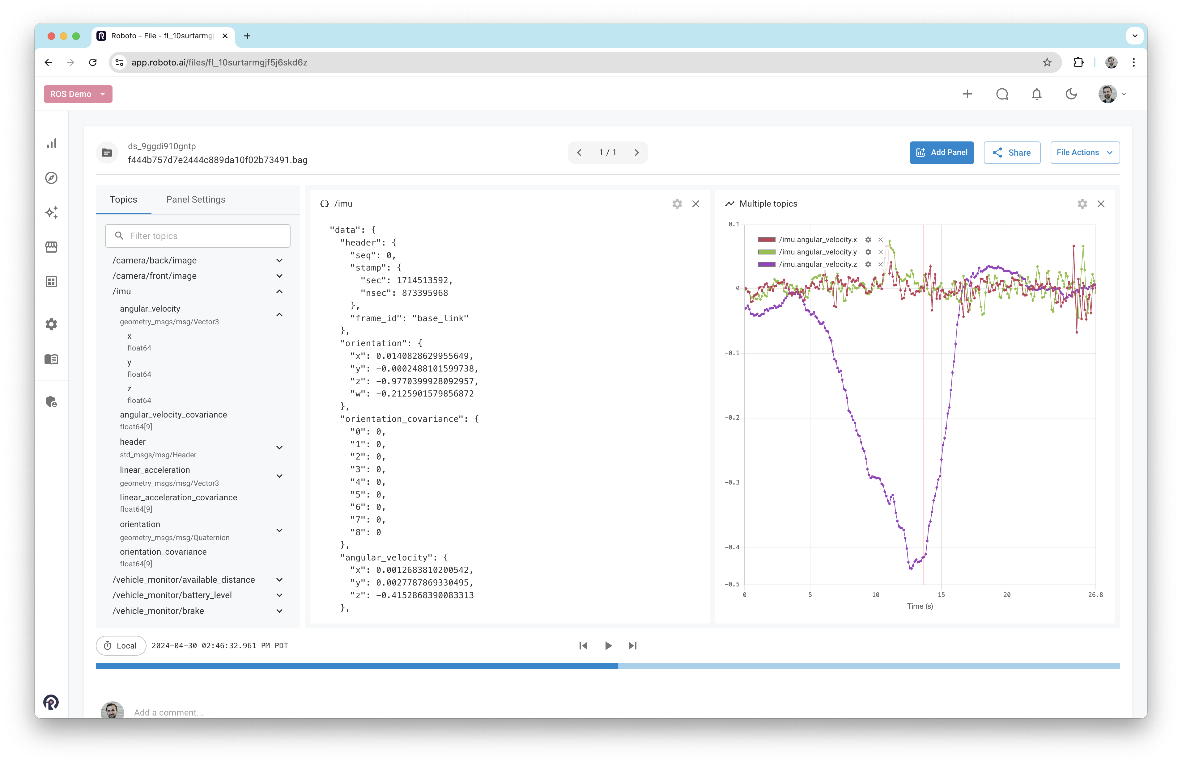 Once a log file has been ingested, double-click it to open it in the Roboto visualizer. On the left-hand side, a list of all available topics and their fields will be displayed. To plot a field, drag it into the workspace. Alternatively, right-click on it and select View in Plot panel.